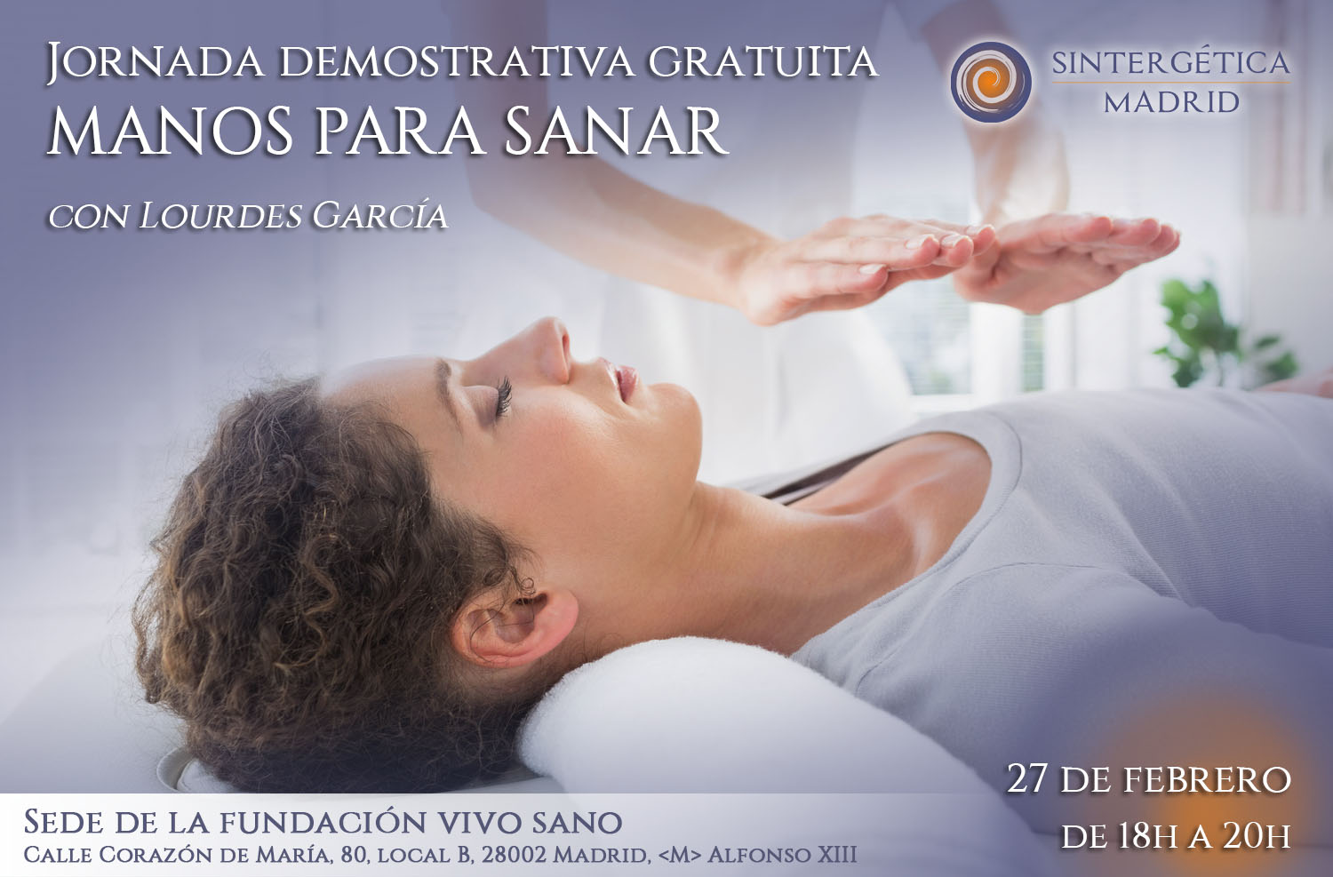 Lourdes García es fisioterapeuta. Formada en hipnosis clínica y relajación, terapia de interacción recíproca y en intervención con psicoterapia de tiempo limitado en trastornos de ansiedad, afectivos, dolor crónico y transtornos psicosomáticos. Utiliza Sintergética y Manos para sanar en el abordaje de las distintas patologías físicas, emocionales mentales y transpersonales.